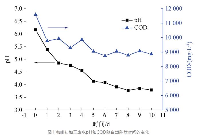 为了解该废水酸化及污染变化特点,研究选取咖啡加工混合水样,对废水pH和COD随时间的变化进行分析,结果如图1所示。特征为高有机物浓度、SS和氨氮,果胶多为可溶性果胶,COD主要于溶解态存在,颗粒、悬浮态约占比2 000~4 000mg/L,有机物易酸化导致废水呈酸性,pH范围为3~5。