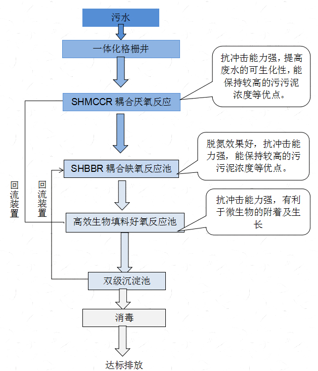 一体化高效生物反应污水处理设备工艺为:SHMCCR耦合厌氧池(A)+SHBBR耦合缺氧池(A)+高效生物填料好氧反应池(O)+双级沉淀池+消毒