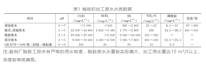 云南某咖啡加工有限公司临沧某加工厂采用湿法加工+生物质锅炉供热烤干工艺,建设规模为25m³(鲜果)/d,咖啡初加工废水主要来源于咖啡鲜果清洗分级、机械脱皮、脱胶及发酵浸泡清洗工序,根据其产生废水的污染程度,可以将其分为咖啡鲜果清洗废水、咖啡湿式(包括发酵浸泡水)和,其典型污染指标见表1。