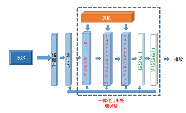 一体化高效生物反应污水处理设备工艺为:SHMCCR耦合厌氧池(A)+SHBBR耦合缺氧池(A)+高效生物填料好氧反应池(O)+双级沉淀池+消毒
